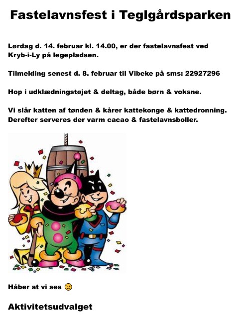 Fastelavn 2026 Oprettet d. 11. januar 2026 /Kategori Nyheder /Med 0 kommentarer Fastelavnsfest i Teglgårdsparken 2026Download Fastelavnsfest i Teglgårdsparken 2026Download